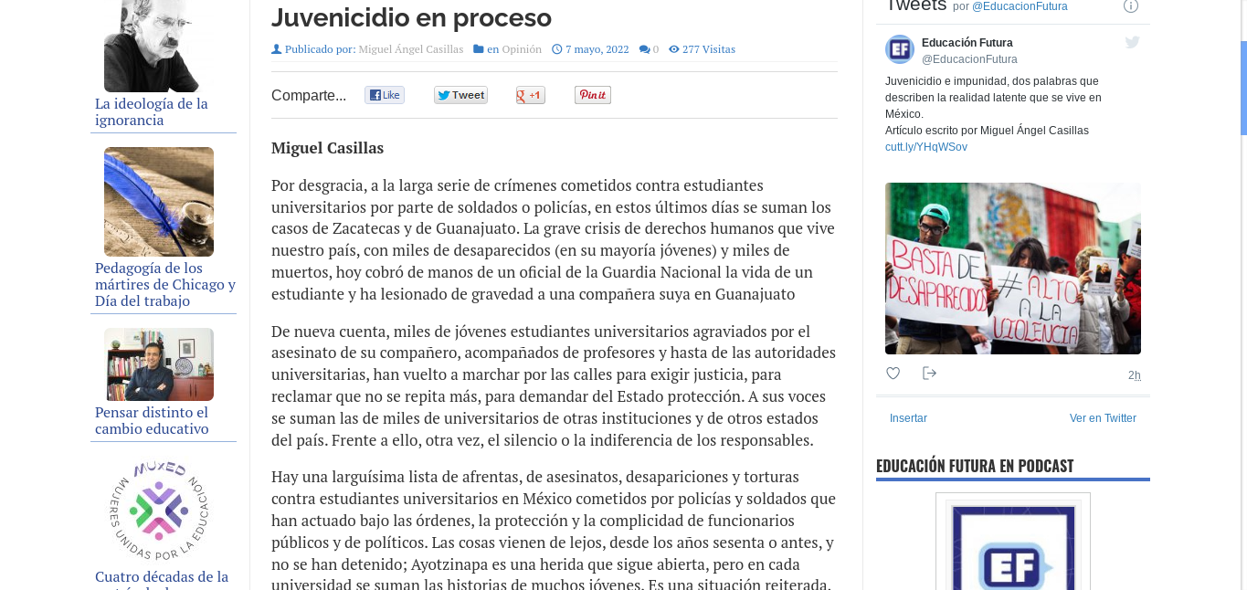 Casillas, M. (7 de mayo de 2022). Juvenicidio en proceso. Educación Futura. Recuperado de: http://www.educacionfutura.org/