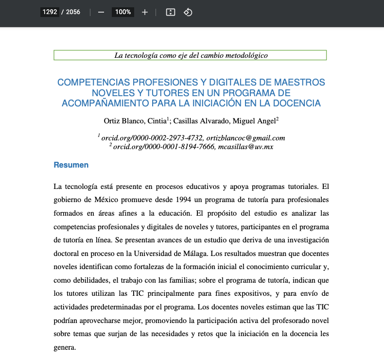Ortiz, B. & Casillas, M. (2020). Competencias profesiones y digitales de maestros noveles y tutores en un programa de acompañamiento para la iniciación en la docencia. En Sánchez, J., Colomo, E., Sánchez, E. & Ruíz, J. (2020). La tecnología como eje del cambio metodológico. UMA Editorial. Versión digital. (pp. 1292-1295). ISBN: 9788413350523