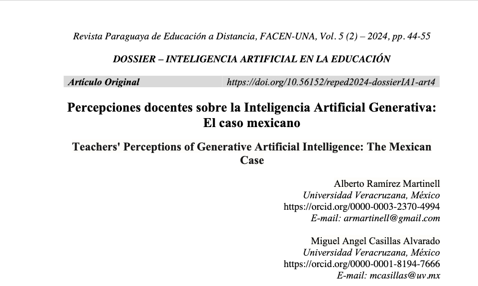 Ramírez, A. y Casillas, M. (2024). Percepciones docentes sobre la Inteligencia Artificial Generativa: El caso mexicano. Revista Paraguaya de Educación a Distancia, FACEN-UNA, Vol. 5(2) –2024, pp. 44-55. https://doi.org/10.56152/reped2024-dossierIA1-art4