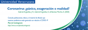 Publicaciones relacionadas con la enfermedad COVID-19 Namihira Guerrero, D. Namihira-Guerrero, R. & Meneses Namihira D., (2021) Glosario básico para entender la vacunación contra la Covid-19 Torrealba-Rodriguez, O., Conde-Gutiérrez, R. A., & Hernández-Javier, A. L. (2020). Modeling and prediction of COVID-19 in Mexico applying mathematical and computational models. Chaos, Solitons & Fractals, 138, 109946. https://doi.org/10.1016/j.chaos.2020.109946 Investigador creó modelo matemático que predice casos de Covid-19 Namihira Guerrero, D. & Namihira-Guerrero, R. (2020) Glosario epidemiológico 2020 para entender la pandemia COVID-19 UV y UNAM publican glosario epidemiológico para entender la pandemia Aranda Abreu, G. E., Hernández Aguilar, M. E., Herrera Covarrubias, D., & Rojas Durán, F. (2020). Amantadine as a drug to mitigate the effects of COVID-19. Medical Hypotheses, 140. https://doi.org/10.1016/j.mehy.2020.109755 Científicos del Cice publican artículo sobre compuesto para mitigar efectos de Covid-19 Gabriel Argüelles, J. R., Gabriel Argüelles, E., & Benitez Mariño, E. (2020). Coronavirus ¿pánico, exageración o realidad?. Universidad Veracruzana.