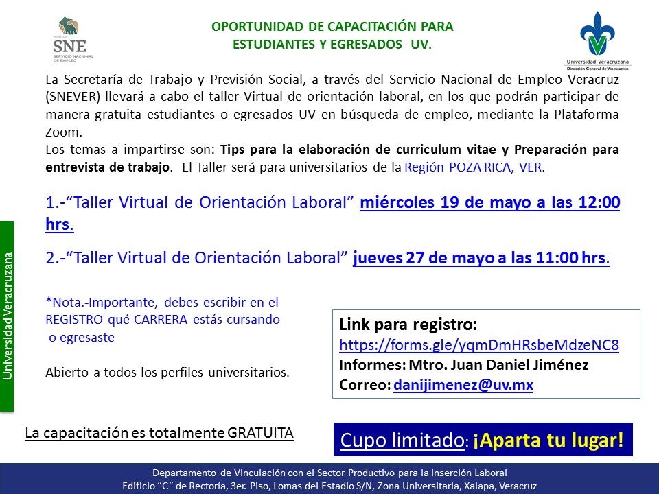 1.- “Taller Virtual de Orientación Laboral” miércoles 19 de mayo a las 12:00 hrs.