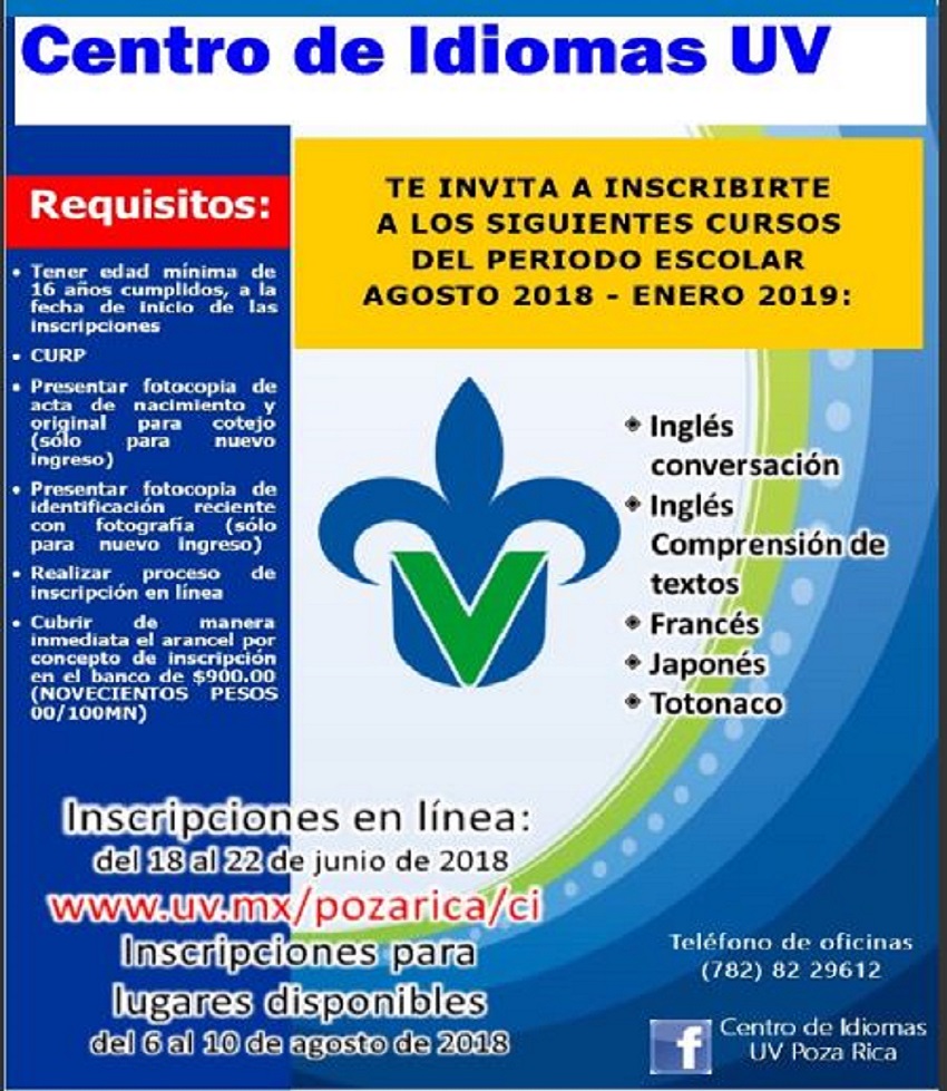 El Centro de Idiomas UV Te invita a inscribirte a los cursos que se impartirán en el periodo Agosto 2018-Enero 2019.