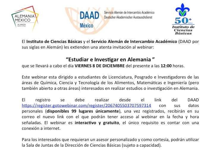 El Instituto de Ciencias Básicas y el servicio Alemán de Intercambio Académico (DAAD por sus siglas en Alemán) les extiende una atenta invitación al Webinar.