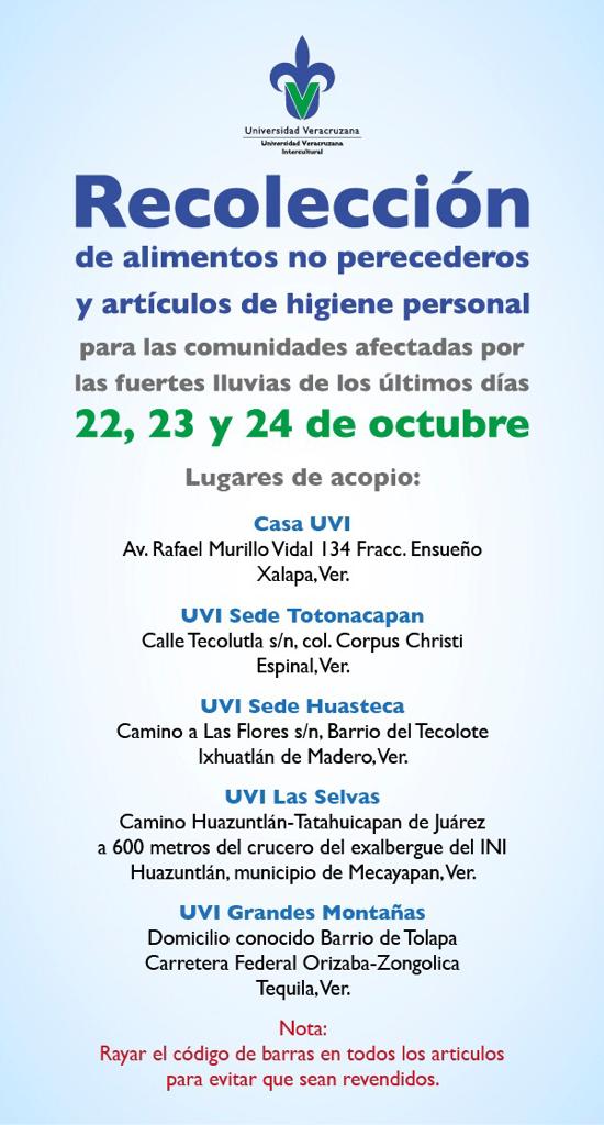 22,23 y 24 de Octubre: Recolección de alimentos no perecederos y artículos de higiene personal.