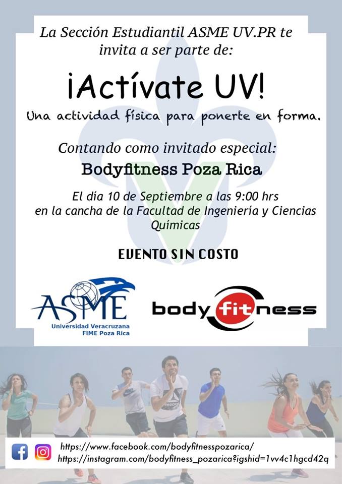 ¡Actívate UV!, una actividad física para ponerte en forma. Facultad de Ingeniería Mecánica y Eléctrica Campus Poza Rica y la Sección estudiantil ASME UV PR invita a toda la comunidad universitaria a participar en el gran evento ¡ACTÍVATE UV!: