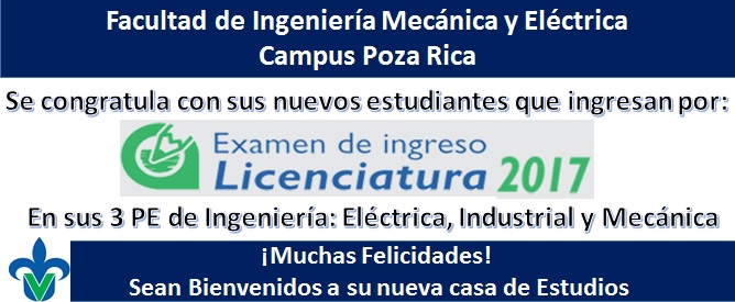 Facultad de Ingeniería Mecánica y Eléctrica del Campus Poza Rica, se congratula con sus estudiantes de nuevo ingreso de la Generación 2017 en sus 3 PE de Ingeniería: Eléctrica, Mecánica e Industrial.
