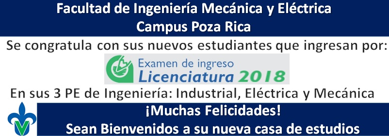 Facultad de Ingeniería Mecánica y Eléctrica del Campus Poza Rica, se congratula con sus estudiantes de nuevo ingreso de la Generación 2018 en sus 3 PE de Ingeniería: Industrial, Eléctrica y Mecánica.