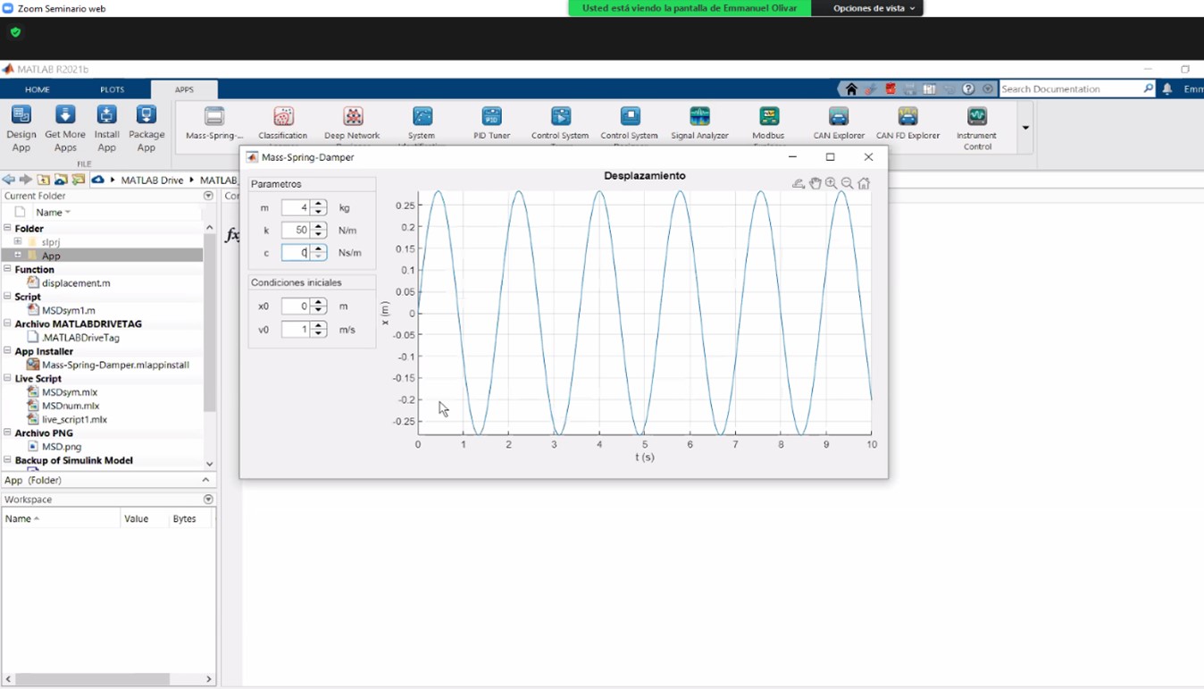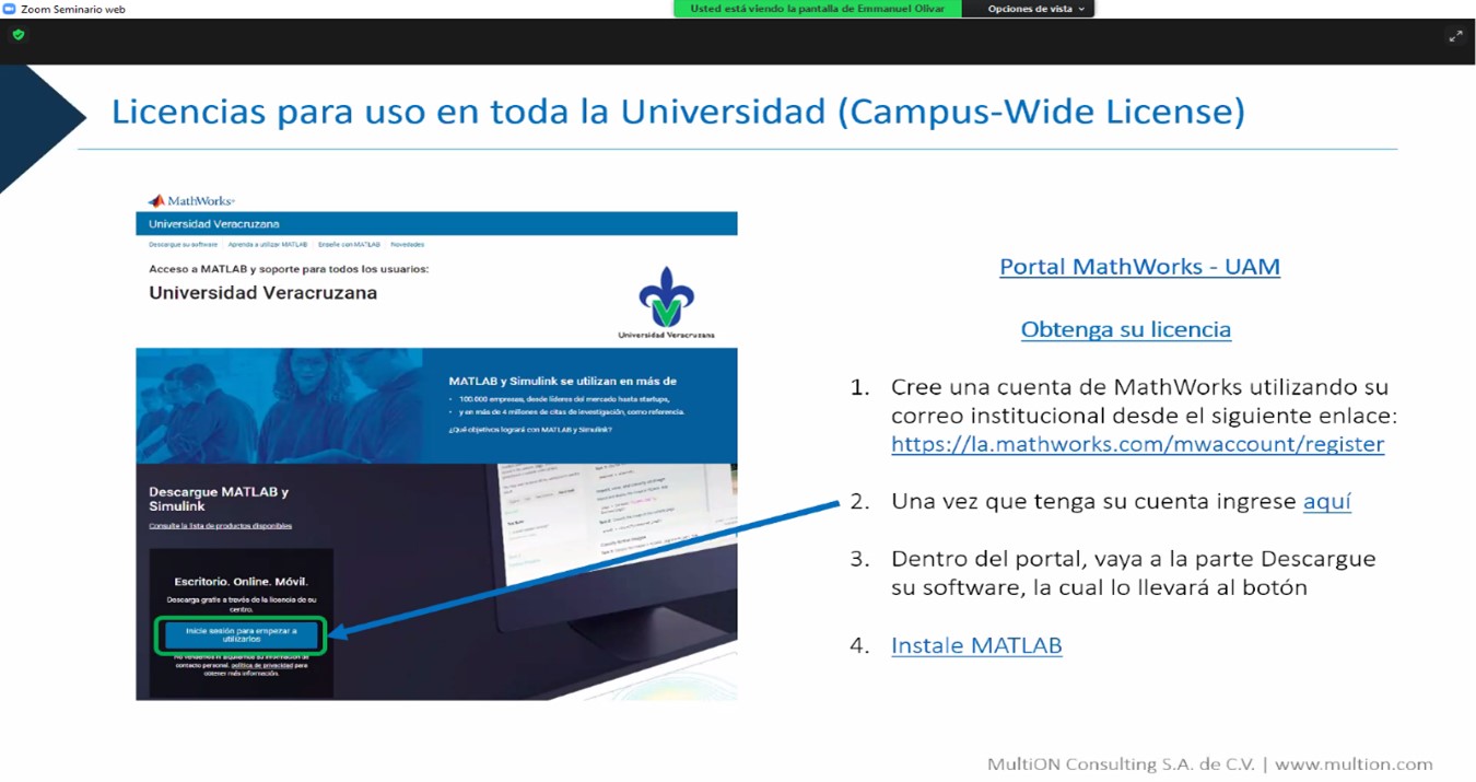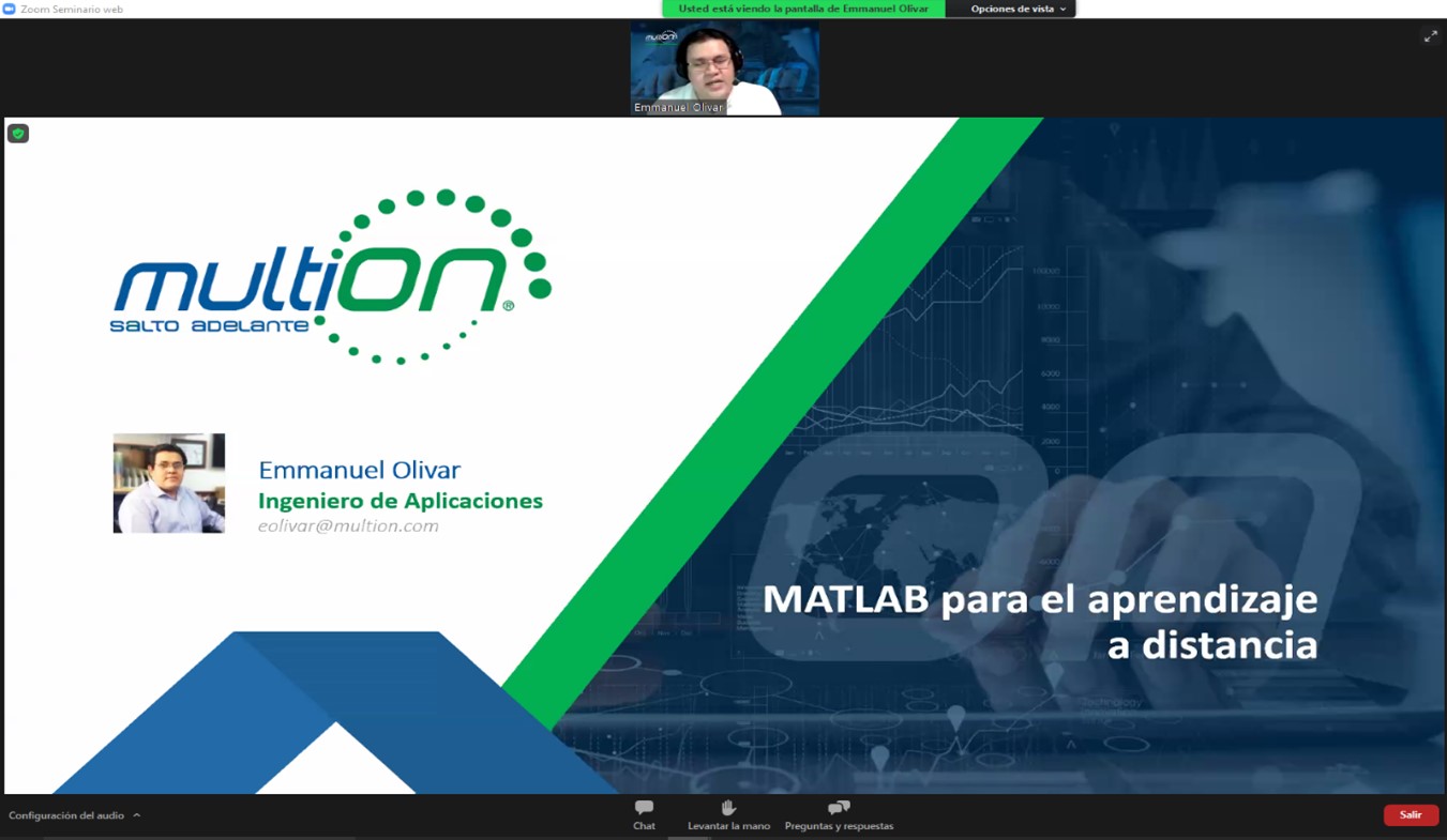 Siendo las 17:00 horas del lunes 21 de febrero del 2022, se llevó a cabo la capacitación del Software Matlab, todo esto dentro de la plataforma Zoom, por la cuestión sanitaria actual, cabe destacar que la presentación fue llevada a acabo por el Ing. Emmanuel Olivar (Ingeniero de Aplicaciones de MultiOn), quien en todo momento mostró su profesionalismo, amabilidad, paciencia y domino del tema, así mismo, el principal objetivo de la reunión fue el uso de Matlab para el aprendizaje a distancia, todo esto para beneficio de los académicos y alumnos de nuestra facultad.