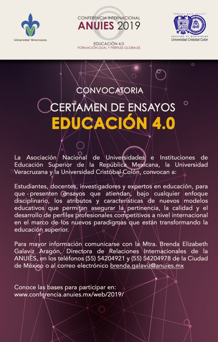 Facultad de Ingeniería Mecánica y Eléctrica en el campus Poza Rica en difusión invita a la comunidad universitaria a participar en el certamen de ensayos en la Conferencia Internacional ANUIES 2019 “Educación 4.0, Formación Dual y Perfiles Globales”.