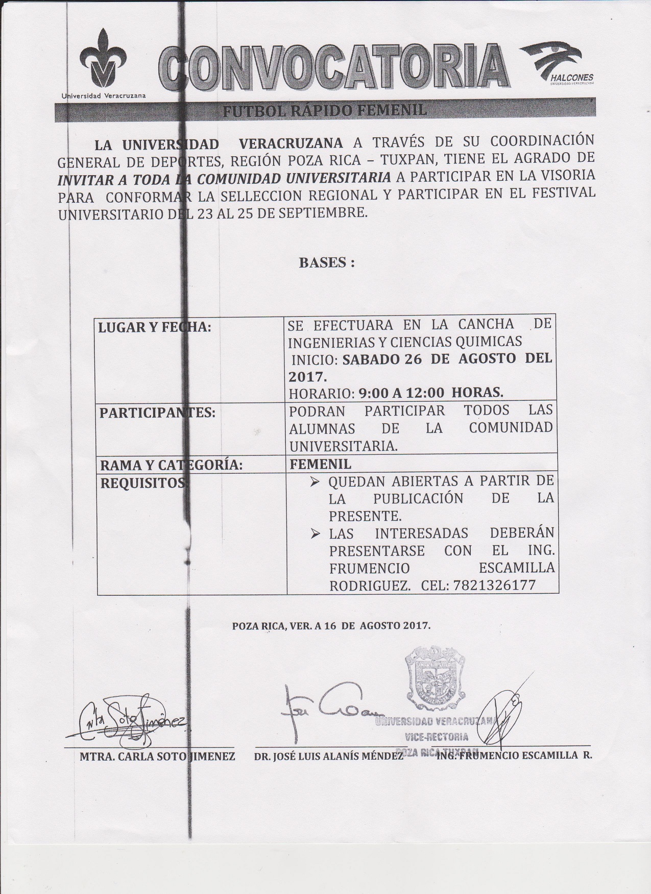 Convocatoria: Futbol femenil rápido (Visoría). Facultad de Ingeniería Mecánica y Eléctrica de la Universidad Veracruzana en el Campus Poza Rica en difusión: