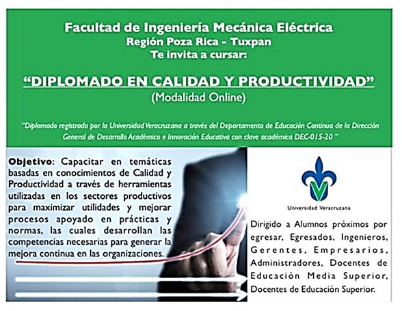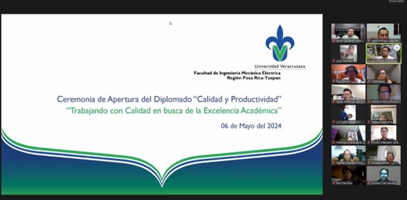 Siendo las 19:00 horas del Lunes 06 de Mayo del 2024, se llevó a cabo la Inauguración del Diplomado “Calidad y Productividad” de forma virtual, la videoconferencia tuvo lugar en la sala de reuniones de la Facultad de Ingeniería Mecánica y Eléctrica región Poza Rica – Tuxpan dentro de la plataforma Zoom, dentro de los asistentes a dicho evento se encontraron el Mtro. César Enrique Martínez Sánchez (Secretario Académica de la Región Poza Rica – Tuxpan), la Mtra. Nayheli Grajales Méndez (Secretaria Regional de Finanzas), El Mtro. Javier Calderón Sánchez (Director de la Facultad de Ingeniería Mecánica Eléctrica), la Ing. Tatiana Lupita Izaguirre Gallegos (Coordinadora Regional de Seguimiento de Egresados), el Dr. Jorge Alberto Chagoya Ramírez (Enlace de Vinculación y Extensión de los Servicios de la Facultad de Ingeniería Mecánica Eléctrica; y Enlace de Educación Continua de la entidad), este último encargado de dirigir el evento.
