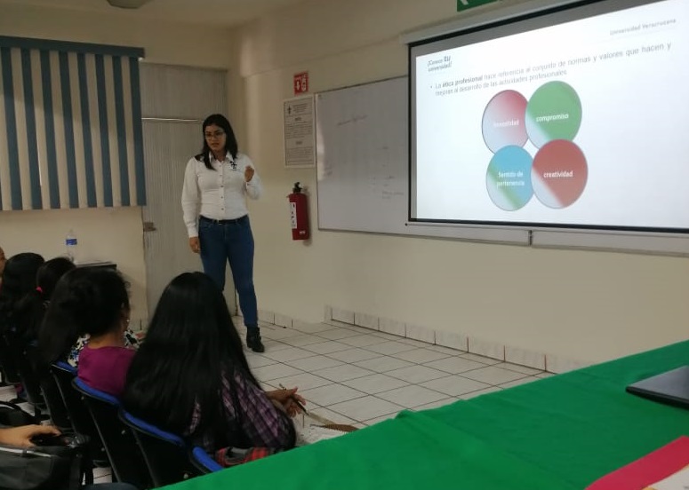 La Mtra. Anahí Hernández expuso a los jóvenes universitarios la importancia que representa tener siempre presente los principios de ética, actuando con profesionalismo no solo en el campo laboral sino en la vida ordinaria, aplicando siempre los valores, anteponiendo en todo momento el interés personal y actuando con respeto hacia el semejante, para ello realizó una dinámica de equipo donde los estudiantes tuvieron que mostrar sus cualidades sustentadas en valores y llevando en ello la reflexión de experiencia y aprendizaje de vida.