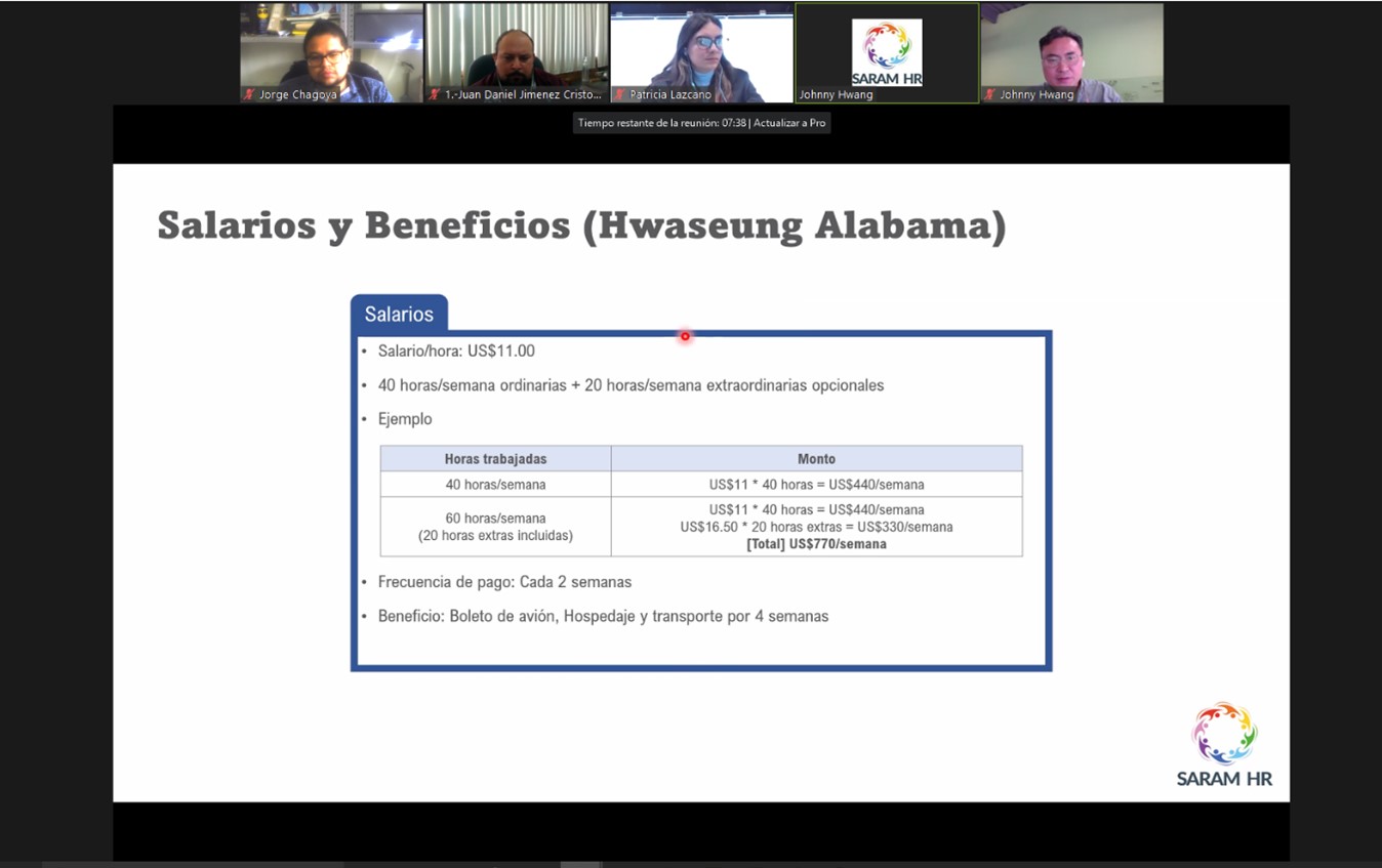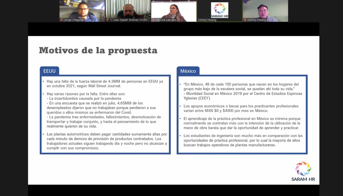 Siendo las 10:30 horas del día Jueves 11 de Noviembre del 2021 se llevo a cabo la reunión virtual entre la Facultad de Ingeniería Mecánica Eléctrica y la empresa SARAM HR, la videoconferencia tuvo lugar en la sala de reuniones del Área Técnica Región Poza Rica – Tuxpan dentro de la plataforma Zoom, los asistentes a dicho evento fueron: la Lic. Patricia Lazcano (Coordinadora de Proyectos), el Ing. Johnny Hwang (Representante Legal), el Mtro. Juan Daniel Jiménez Cristóbal (Coordinador Regional de Vinculación y Extensión de los Servicios de la Región Poza Rica – Tuxpan) y el Mtro. Jorge Alberto Chagoya Ramírez (Enlace de Vinculación y Extensión de los Servicios de la Facultad de Ingeniería Mecánica Eléctrica); es importante mencionar que la búsqueda de convenios con el sector productivo busca sobre todo favorecer a la formacion de capital humano con las características de fortalecer los proyectos que permitan beneficiar no solamente a la industria, sino que a la sociedad en general; de igual manera esto refuerza los campos de la vinculación existentes y abre la posibilidad de seguir creciendo a los Pe de Ingeniería Industrial, Ingeniería Mecánica Eléctrica y la Maestría en Ciencias de la Ingeniería.