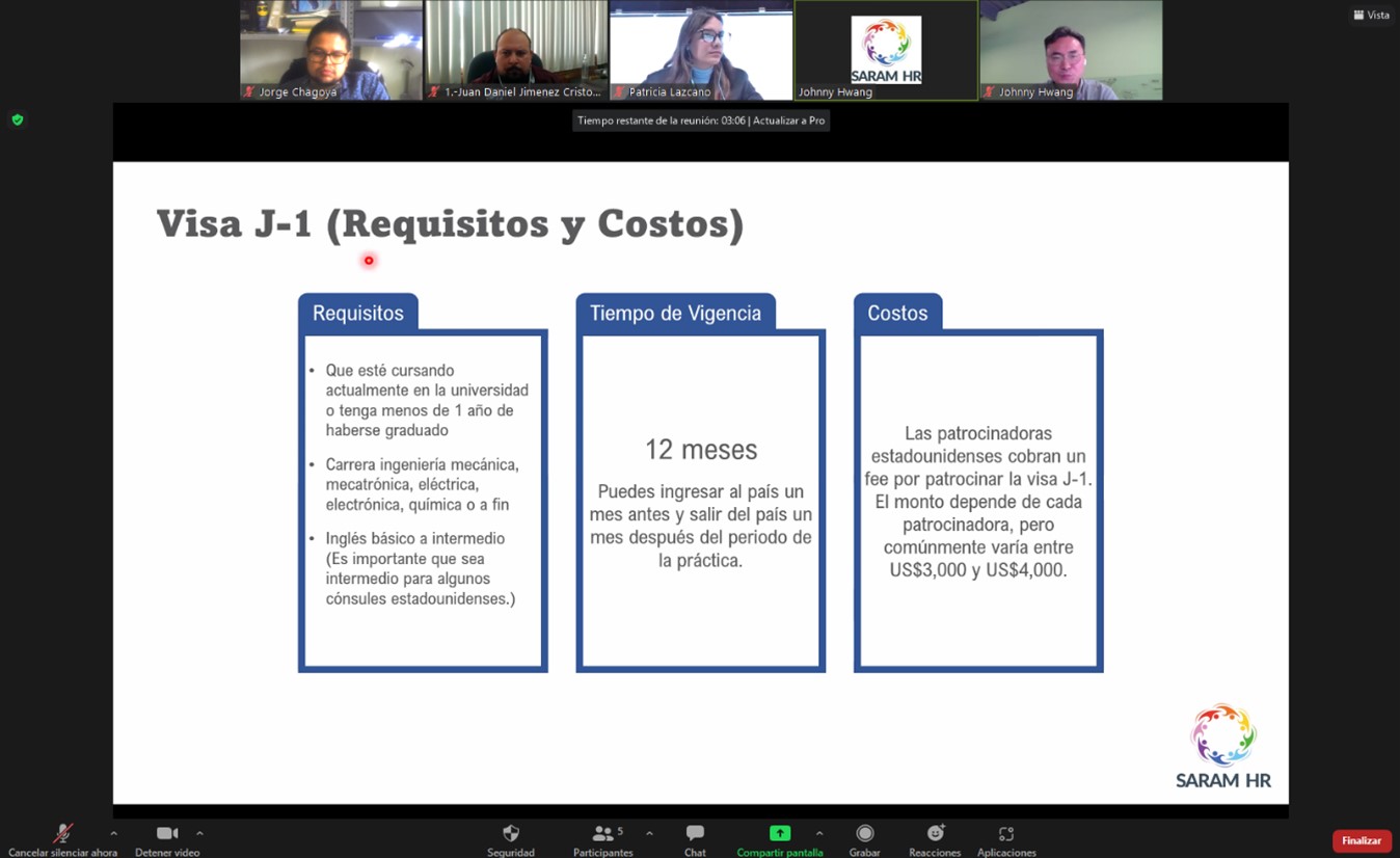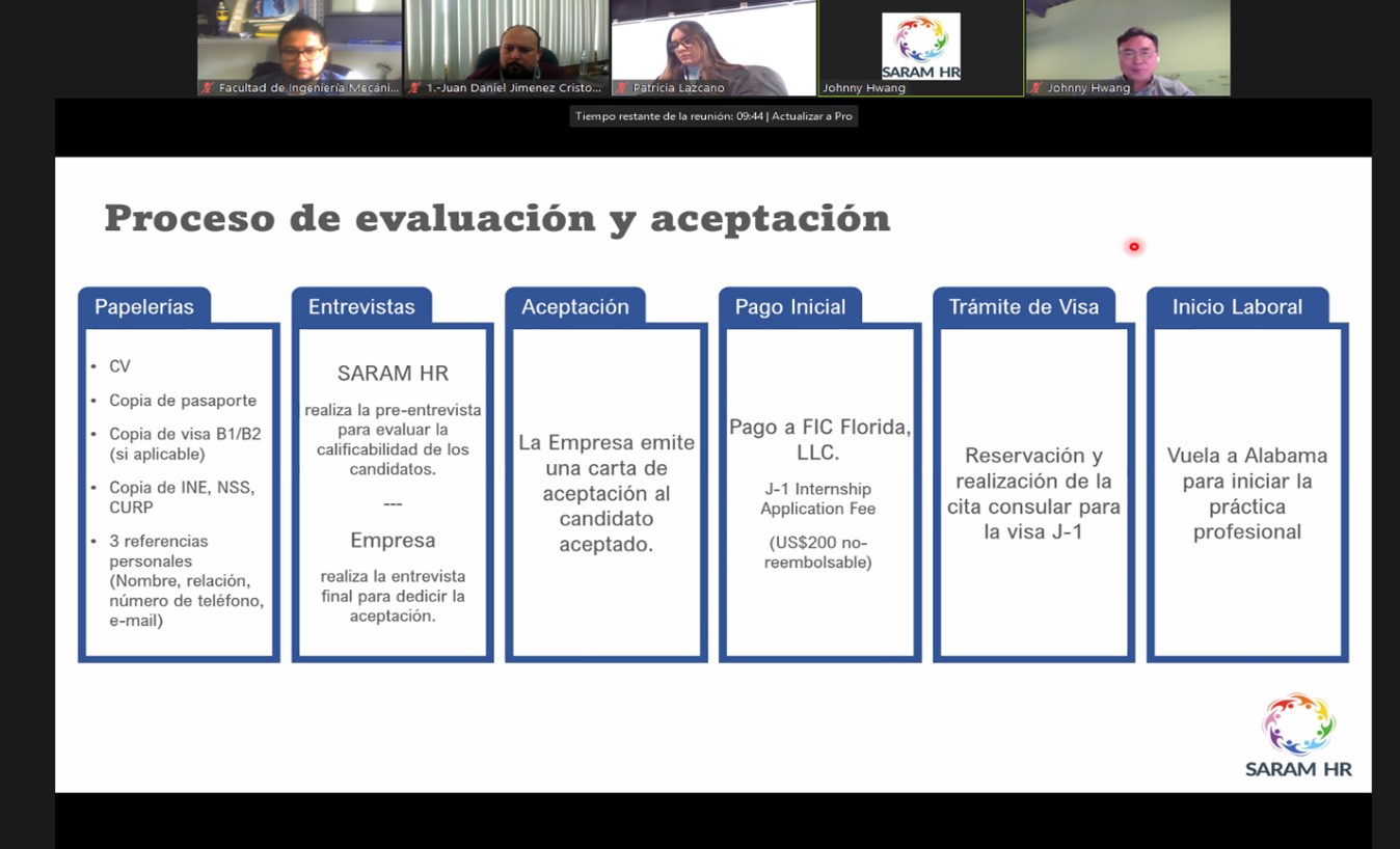Uno de los aspectos importantes informados durante la Platica del C. Hwang fue la de lo que el aspirante pudiera llegar a generar, desde la parte económica hasta la parte de aprendizaje, entre los aspectos o requisitos a considerar por cada uno de los aspirantes fue de vital importancia el idioma Ingles en un nivel intermedio, así como generar una visa de trabajo para un lapso de 12 meses, sin duda alguna, es una propuesta que genera un gran impacto dentro del aspecto de la vinculación internacional, de igual manera mencionó que una de las razones importantes de querer trabajar en conjunto con esta Institución Educativa es porque la Facultad lleva a cabo un gran trabajo dentro de sus instalaciones, las cuales cuentan con personal que constantemente se encuentra capacitándose dentro del área disciplinar y académica, lo cual permite al estudiante destacar dentro del mundo laboral al momento de egresar.