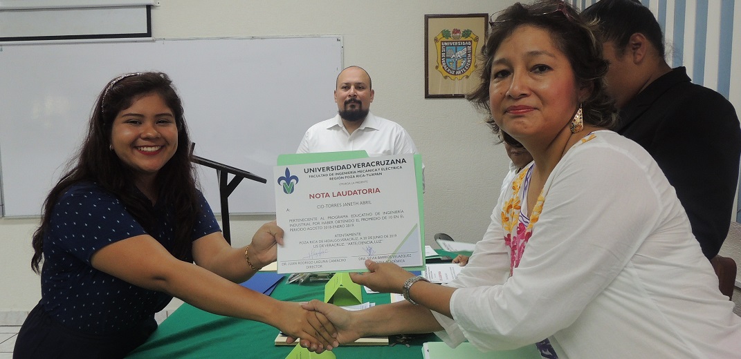El día 20 de Junio del año en curso en una emotiva ceremonia llevada a cabo en el salón de actos de la Facultad de Ingeniería Mecánica y Eléctrica de la Universidad Veracruzana en la región Poza Rica-Tuxpan en punto de las 12:30 Hrs., ésta entidad académica realizó la entrega de Notas Laudatorias a sus estudiantes más destacados por su rendimiento académico en el periodo escolar Agosto 2018-Enero 2019 de los 3 PE de Ingeniería Eléctrica, Mecánica e Industrial.