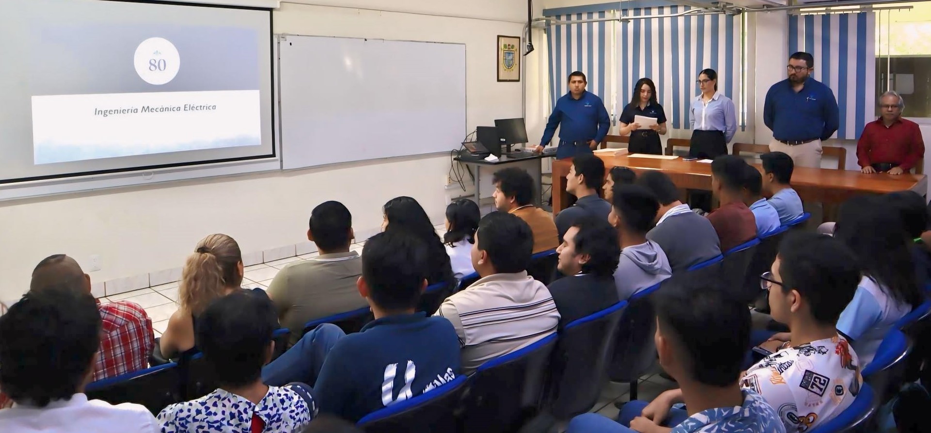 La primera ceremonia correspondiente al PE de Ingeniería Mecánica Eléctrica Plan 2020, se realizó el día martes 27 de Febrero a las 12:00 horas en el Salón de Actos de la FIME. En el presídium estuvieron presentes el Mtro. Javier Calderón Sánchez Director de la Facultad de Ingeniería Mecánica y Eléctrica, el Mtro. Gabriel Juárez Morales, Secretario Académico de las Facultades de Ingeniería, así mismo se contó con la presencia de los académicos el Dr. Jesús Enrique Escalante Martínez, el Mtro. Francisco Javier Hernández Luna y la Ing. Tatiana Lupita Izaguirre Gallegos. Es importante mencionar que también estuvieron presentes algunos padres de familia, quienes disfrutaron de la entrega de las notas laudatorias.