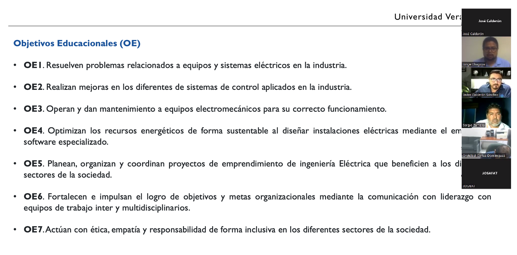 Ing. Juan Carlos Tinoco Herrera: “En cuestión al OE #4, se requiere especificar qué tipo de instalaciones se van a desarrollar mediante software, para que el egresado tenga conocimiento sobre el diseño, rediseño y optimización, sobre las instalaciones eléctricas dependiendo el área donde estarán enfocadas”.