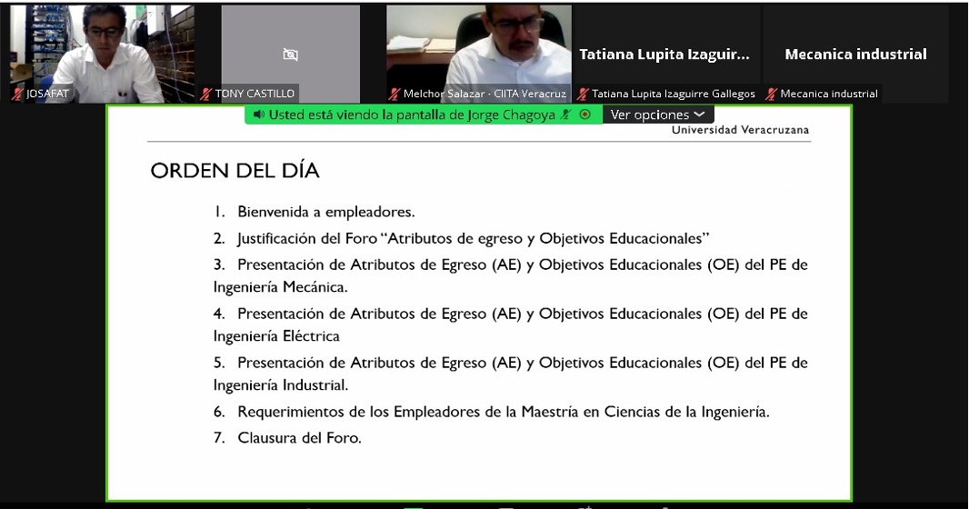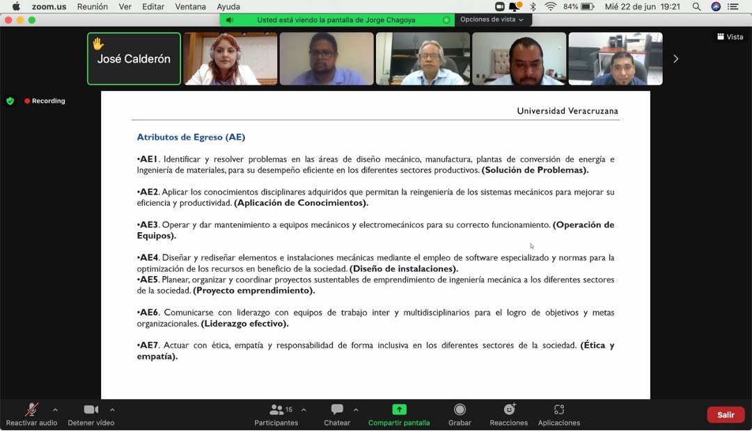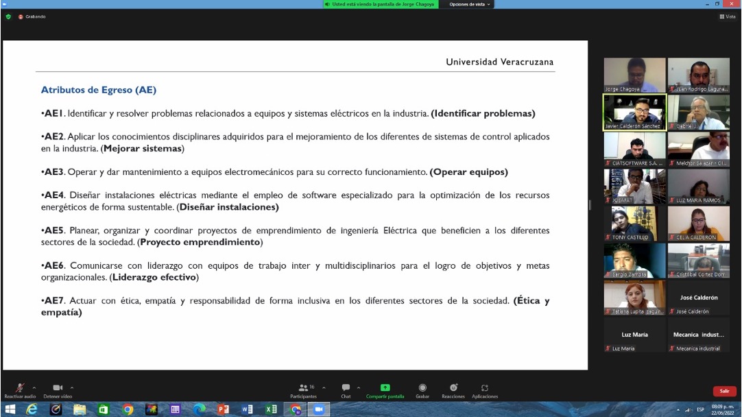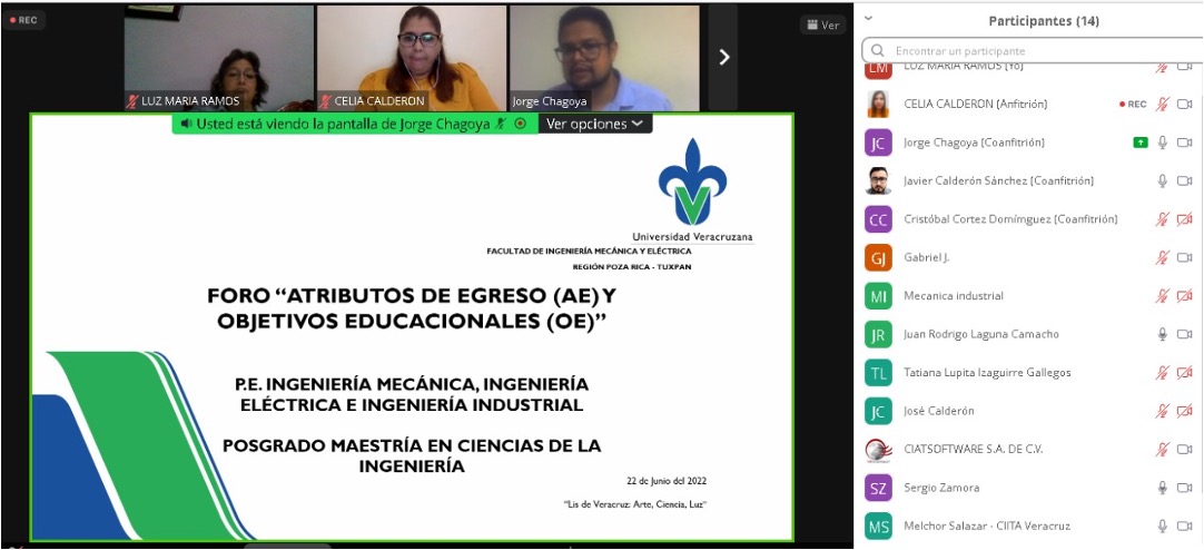El día 22 de junio de 2022, en punto de las 19:00 horas, se llevó a cabo el “Foro: Atributos de Egreso (AE) y Objetivos Educacionales (OE)”, donde se reunieron de manera virtual el distinguido Dr. Juan Rodrigo Laguna Camacho, Director de la Facultad de Ingeniería Mecánica y Eléctrica, el Mtro. Gabriel Juárez Morales, Secretario de las Facultades de Ingeniería, importantes empleadores de la región: