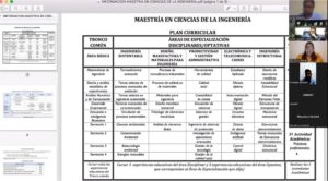 Para iniciar con la participación a nivel posgrado, la Dra. Celia María Calderón Ramón, Coordinadora de la Maestría en Ciencias de la Ingeniería (MCI), presentó el Plan curricular del programa de posgrado, donde resaltó la vinculación con los empleadores para la realización de las prácticas profesionales y/o proyectos de interés. Por otra parte, comentó que para continuar siendo una maestría de calidad el programa, deberá ser evaluado ante el Sistema Nacional de Posgrados de Calidad (SNPC) del Consejo Nacional de Ciencia y Tecnología (CONACYT).