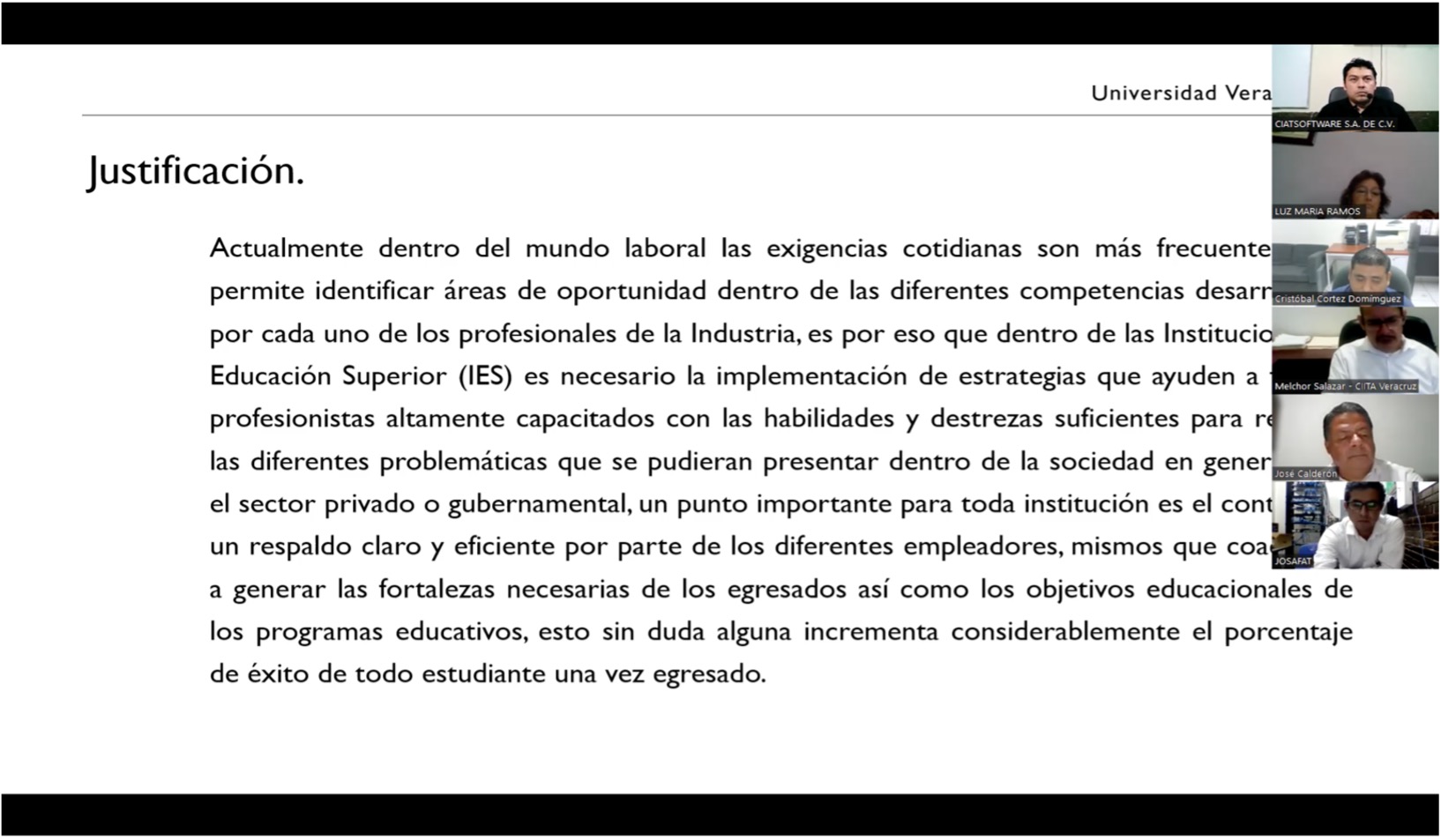 Para dar inicio, el Mtro. Jorge Chagoya, presentó el orden del día y la justificación del foro, el cual fue implementar estrategias que ayuden a formar profesionistas altamente capacitados, con habilidades y destrezas suficientes, para resolver diferentes problemáticas dentro de la sociedad, en el sector privado o gubernamental. Es por ello, que para toda Institución de Educación Superior (IES) es fundamental mantenerse en contacto con diferentes empleadores, con la intención de aplicar procesos de mejoramiento continuo en la enseñanza de la educación superior, considerando los resultados de la valoración de los objetivos educacionales; y el logro de los atributos de nuestros egresados.
