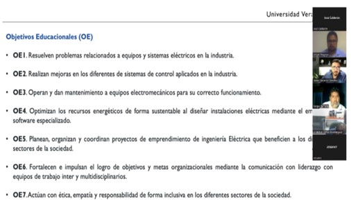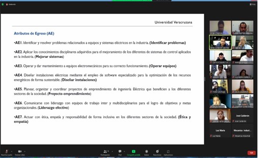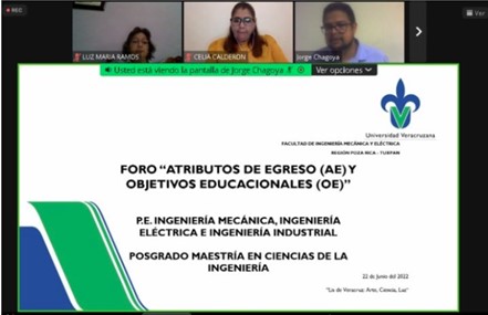 El día 22 de junio de 2022, en punto de las 19:00 horas, se llevó a cabo el “Foro: Atributos de Egreso (AE) y Objetivos Educacionales (OE)”, donde se reunieron de manera virtual el distinguido Dr. Juan Rodrigo Laguna Camacho, Director de la Facultad de Ingeniería Mecánica y Eléctrica, el Mtro. Gabriel Juárez Morales, Secretario de las Facultades de Ingeniería, importantes empleadores de la región: