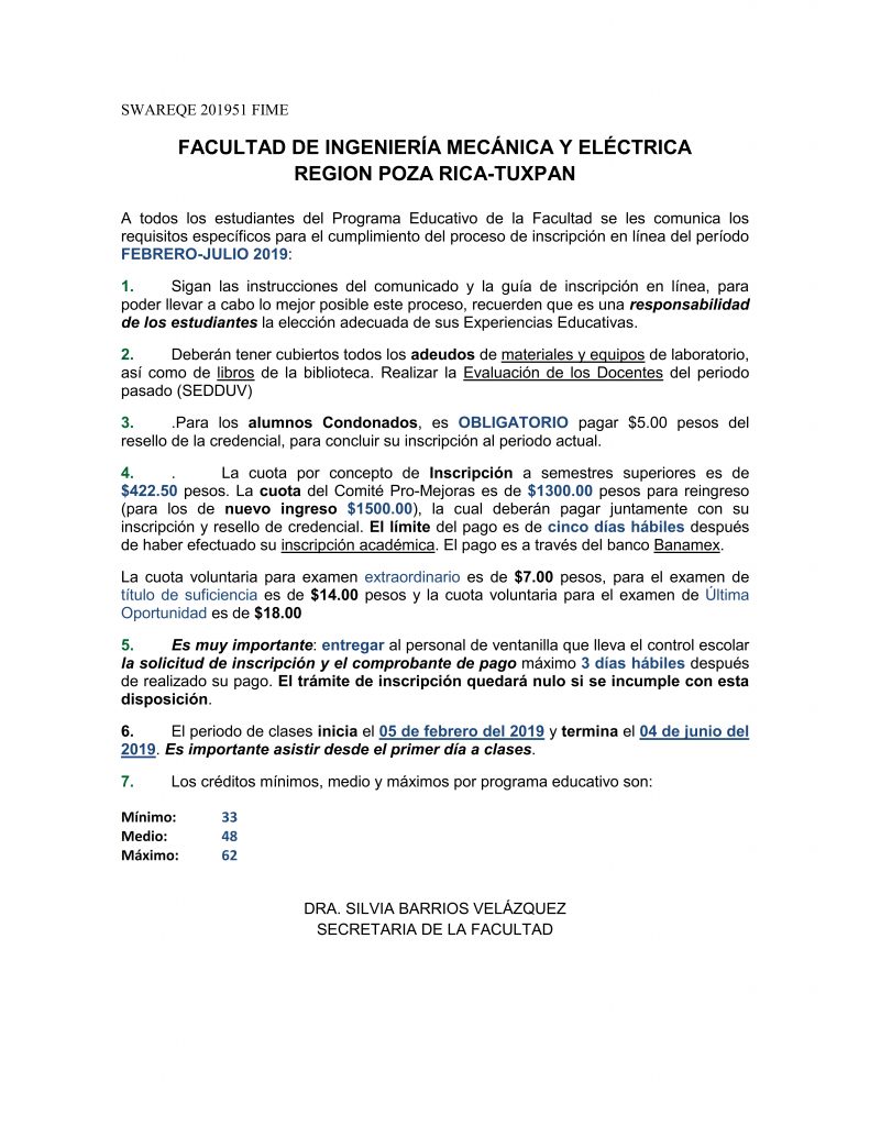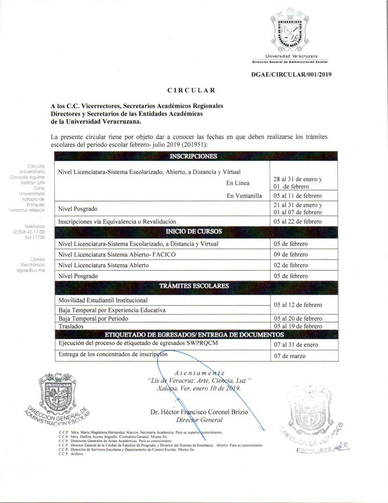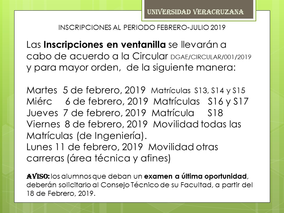 HORARIOS DE INSCRIPCIÓN FEBRERO – JULIO 2019 Fechas de Inscripción Circular DGAE/CIRCULAR/001/2019 Requisitos de Inscripción