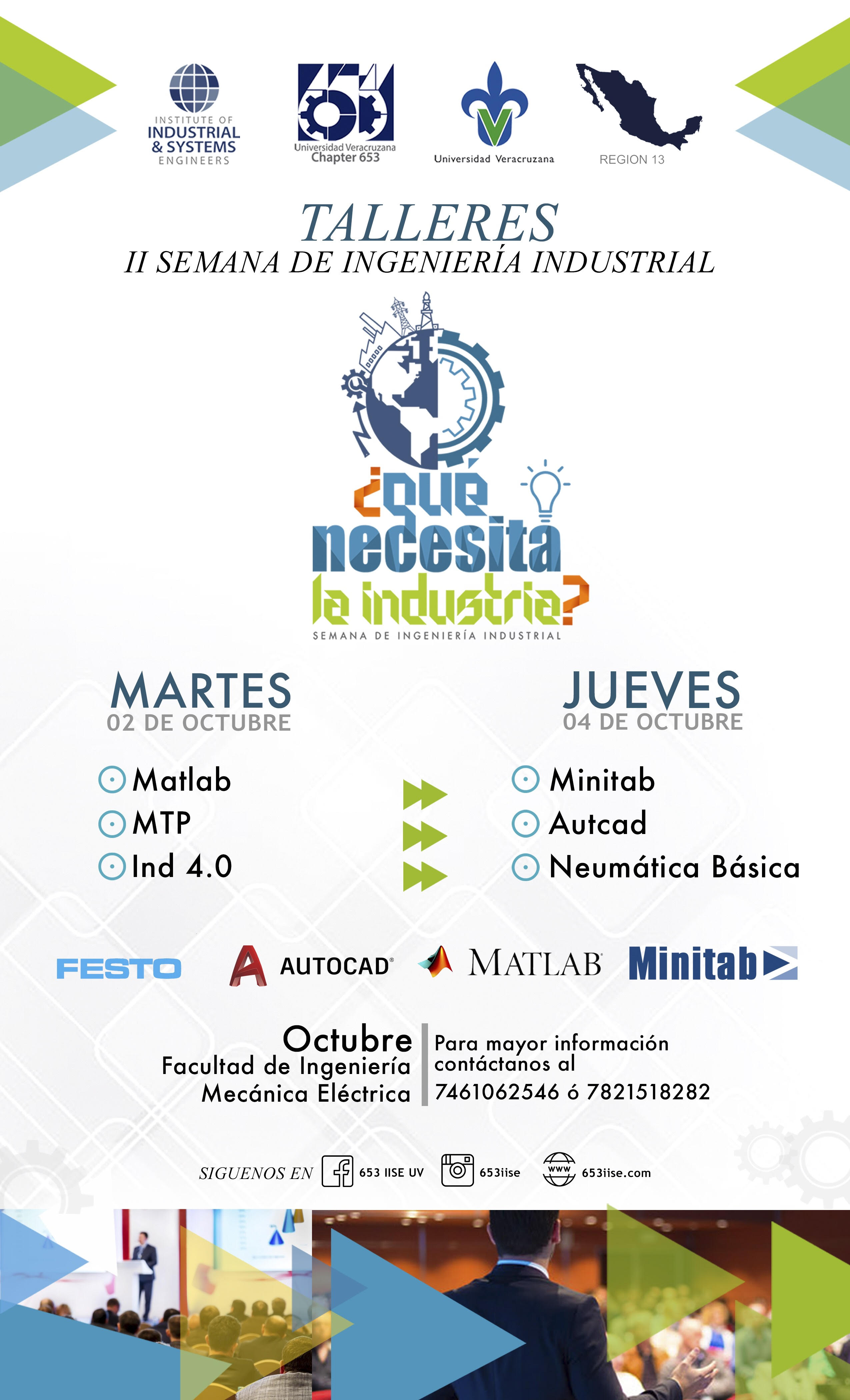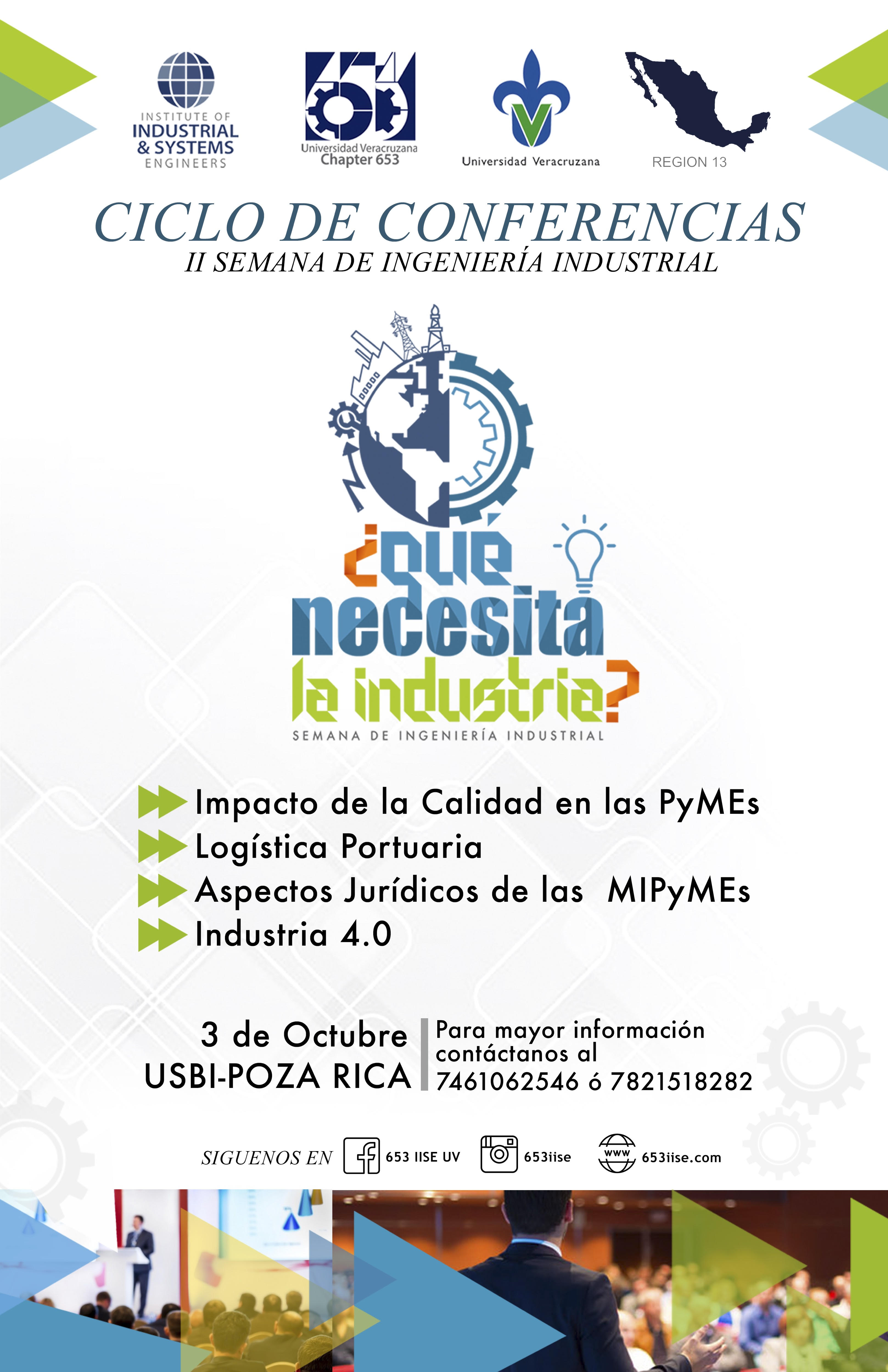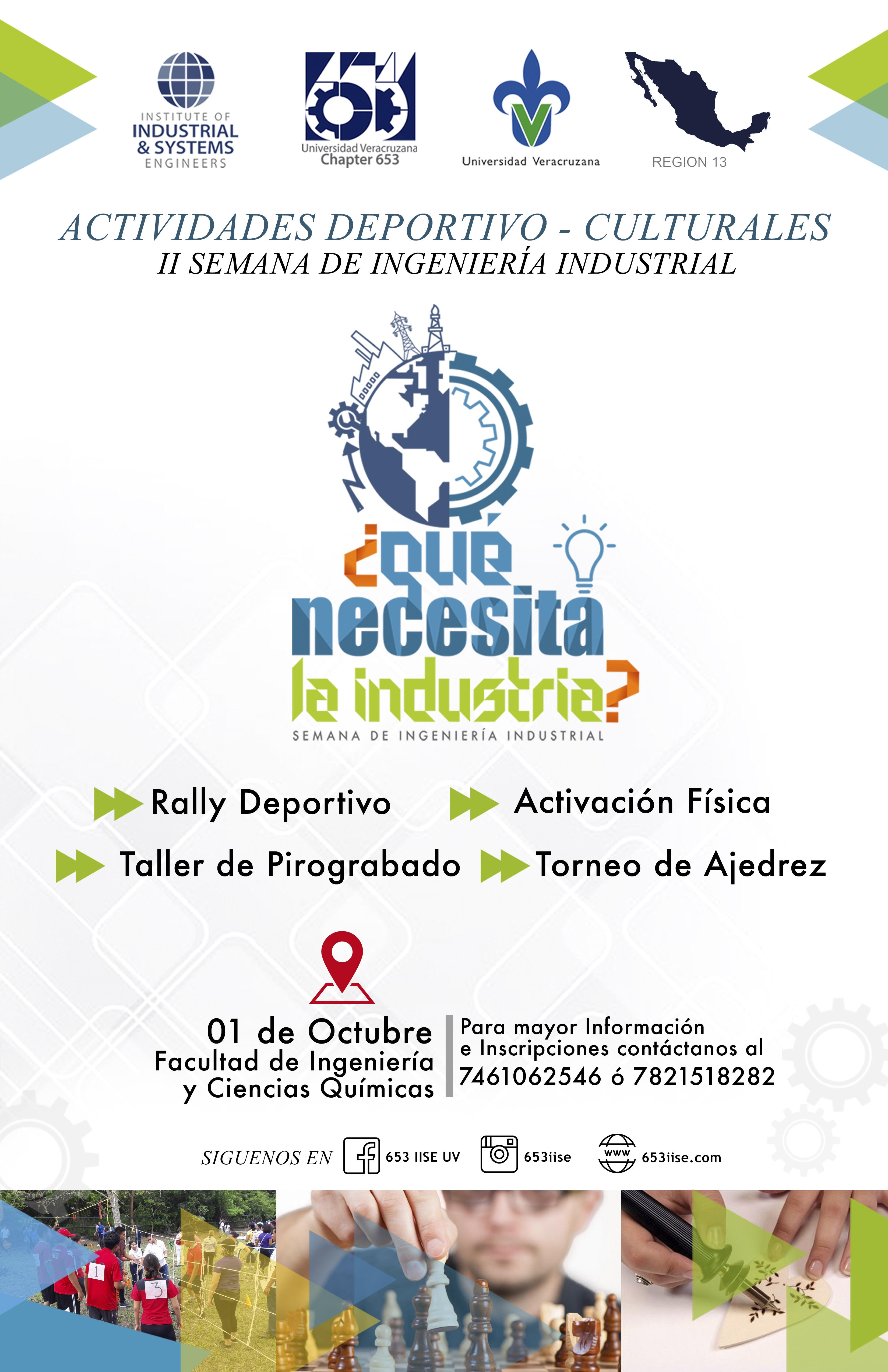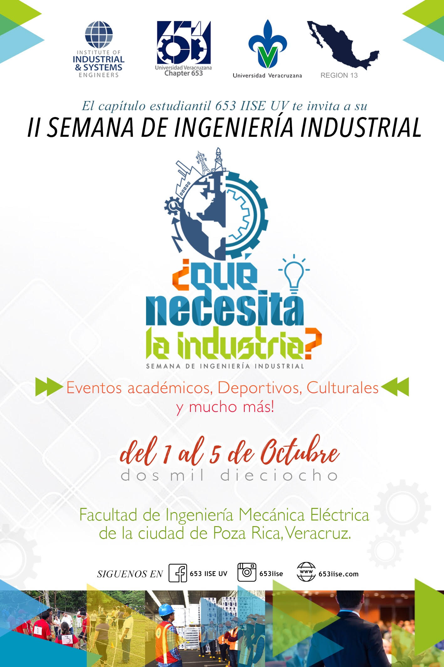 II Semana de Ingeniería Industrial del 1 al 5 de Octubre del 2018 Facultad de Ingeniería invita del Campus Poza Rica invita a la comunidad universitaria asistir y participar de la II Semana de Ingeniería Industrial del 1 al 5 de Octubre del 2018.