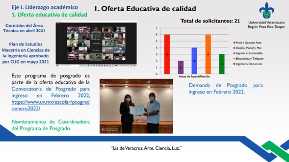 El Dr. Laguna Camacho hizo notar la calidad educativa que se tiene y prevalece al interior de la entidad académica en beneficio de los estudiantes en sus programas educativos de Ingeniería, reconocidos por el Consejo de la Acreditación de la Enseñanza de la Ingeniería en México (CACEI), lo que se vio reflejado en la preferencia y demanda de solicitudes de aspirantes para ingresar por examen de admisión en este año 2021.