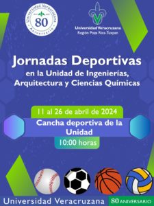 En el marco de las celebraciones por el 80 aniversario de la Universidad Veracruzana, este 11 de abril de 2024 se inauguraron las Jornadas Deportivas en la Unidad de Ingenierías, Arquitectura y Ciencias Químicas. Este evento, que se llevará a cabo del 11 al 26 de abril, brinda a los estudiantes la oportunidad de participar en una amplia gama de disciplinas deportivas, tales como fútbol rápido, básquetbol, voleibol y sóftbol.