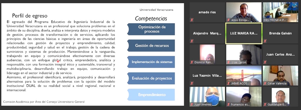 Asimismo, la Mtra. Luz María Ramos González Coordinadora en la entidad académica de la Comisión para el Diseño y Rediseño de los Programas Educativos (CoDiRPE) del PE de la licenciatura de Ingeniería Industrial 2020, fue la encargada de presentar a la junta académica los ajustes realizados al rediseño del PE del plan 2011 al plan 2020, esto en consenso con los integrantes de las demás comisiones de las diferentes regiones de la Universidad Veracruzana, resaltando los aspectos siguientes: Diseño de un plan y programa de estudios con el modelo de competencias que responde a los programas de evaluación y acreditación nacional e internacional; actualización de contenidos del PE; aumento de los créditos del área de formación electiva y los créditos totales del PE; reducción de EE Tronco Común; generación de nuevas EE como Matemáticas Básicas, Análisis de Decisiones, Procesos Industriales, Administración del mantenimiento, Evaluación de Proyectos; así como los requerimientos para acreditar un segundo idioma y ser un requisito de titulación; la estadía profesional y la opción de programa DUAL durante el desarrollo académico del estudiante, entre otras.