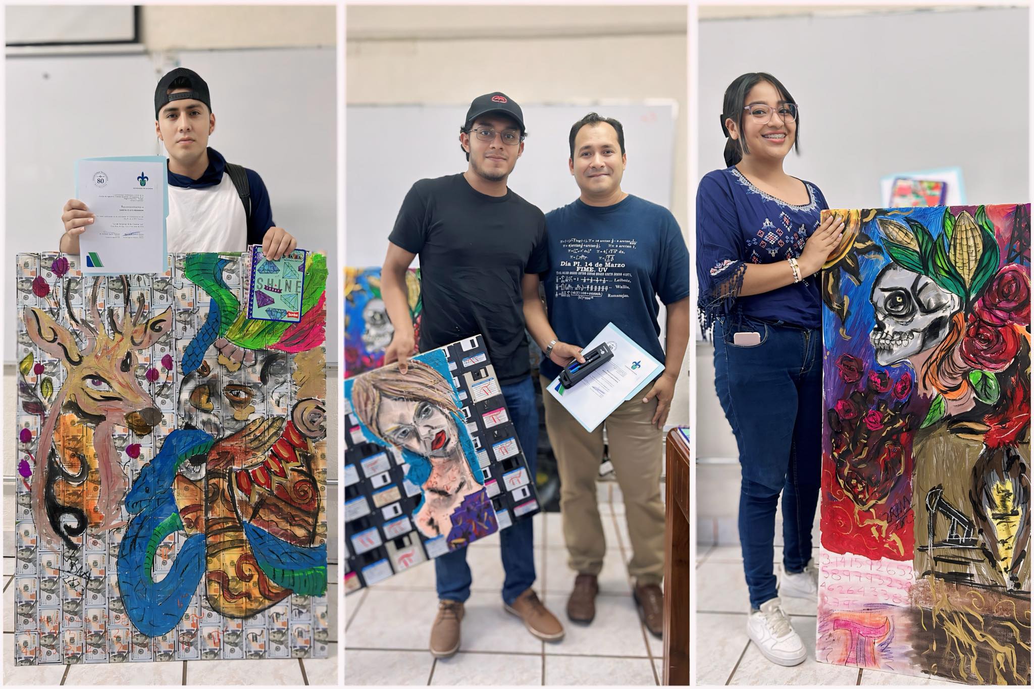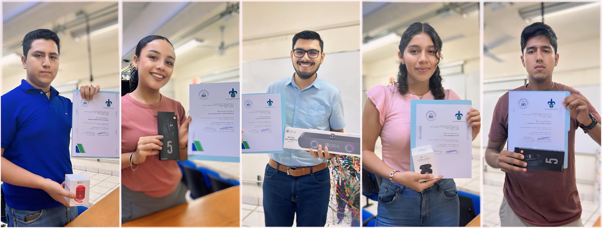 Cada estudiante fue aplaudido y felicitado, así como también se les obsequiaron diferentes aparatos y la entrega de cuadros, los cuales fueron elaborados y donados por el participante Carlos Urbina De Lojo, estudiante de la Maestría en Ciencias de la Ingeniería.