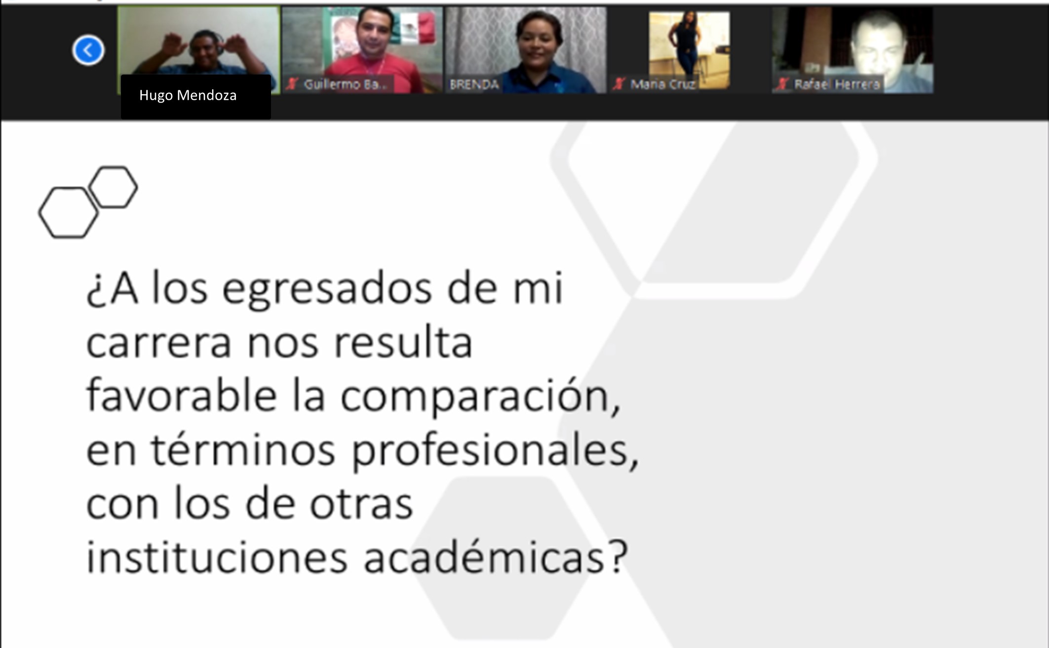 Siendo las 19:00 horas del día 15 de septiembre se llevó a cabo el foro denominado Seguimiento al Egresado “Un encuentro a favor de la Calidad Educativa”, el cual tuvo lugar dentro de la plataforma zoom. Es importante mencionar que este tipo de foros coadyuvan al establecimiento de una comunicación efectiva con cada uno de los egresados de los diferentes Programas Educativos ofertados en esta entidad académica, así mismo, una de la finalidades de dicho evento fue el contar con el acercamiento necesario con los egresados del PE de Ingeniería Mecánica Eléctrica, los cuales mediante sus retroalimentaciones, comentarios, ideas y experiencias vividas en el ramo laboral compartieron un poco de lo que fue su trayectoria a partir de conclusión de sus estudios de licenciatura.