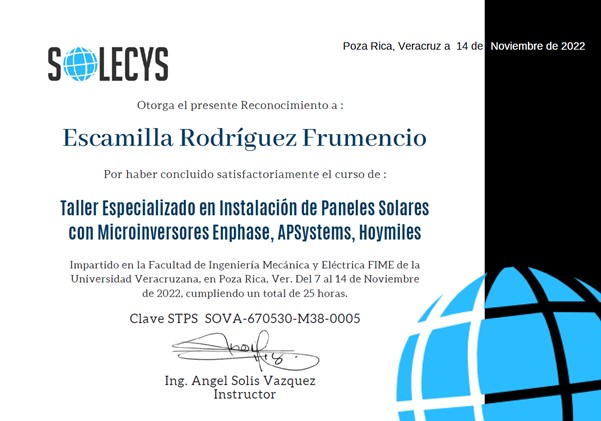 Del 07 al 14 de noviembre de 2022, en la Facultad de Ingeniería Mecánica y Eléctrica (FIME) de la Universidad Veracruzana, región Poza Rica- Tuxpan, se llevó a cabo el taller Especializado en Instalación de Paneles Solares con Microinversores Enphase, APSystems, Hoymiles, el cual fue teórico – práctico y contó con la participación de 25 estudiantes de los Programas Educativos de Ingeniería Eléctrica, Ingeniería Mecánica Eléctrica, Ingeniería Mecánica e Ingeniería Industrial; y 6 académicos de la entidad. Esto como parte de las estrategias de capacitación y actualización de la comunidad académica de la Facultad, planteadas en el Plan de desarrollo de la entidad académica (Pladea) 2021-2025.