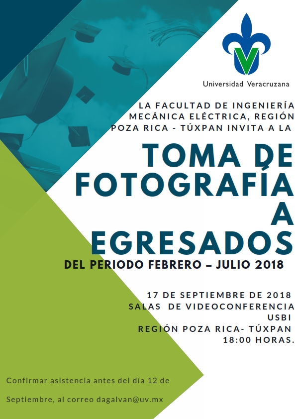 Facultad de Ingeniería Mecánica y Eléctrica invita a sus egresados en el periodo Febrero-Julio 2018 asistir a la Toma de Fotografía el día 17 de Septiembre del 2018 a las 18:00 Hrs. en la sala de la USBI Poza Rica.