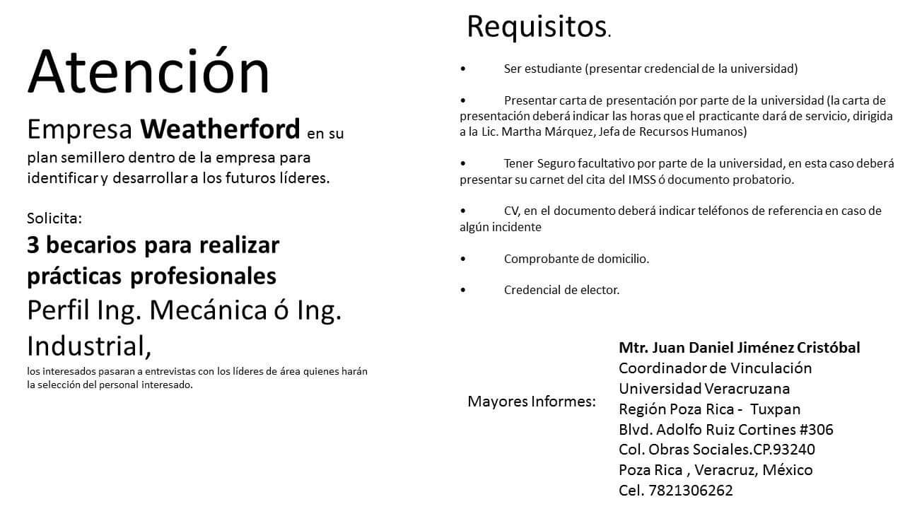 Weatherford solicita 3 becarios. Facultad de Ingeniería Mecánica y Eléctrica Campus Poza Rica en difusión a su comunidad de estudiantes:
