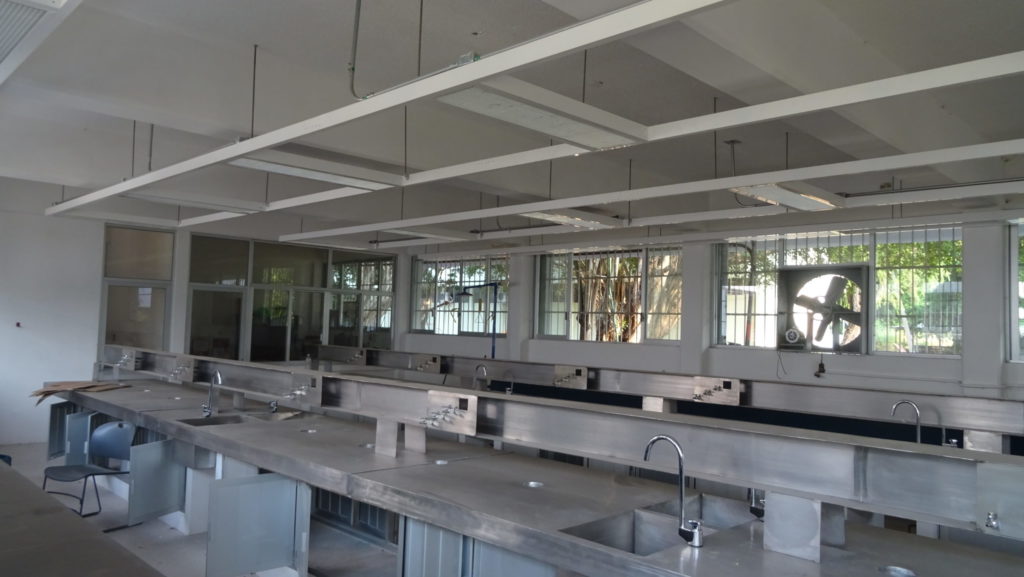 Se localiza en la planta baja del Edificio B ocupando un área de 120 m2. Este espacio esta destinado para el laboratorio de Materiales, Mecánica de Suelos y pavimentos y Topografía y Geodesia.