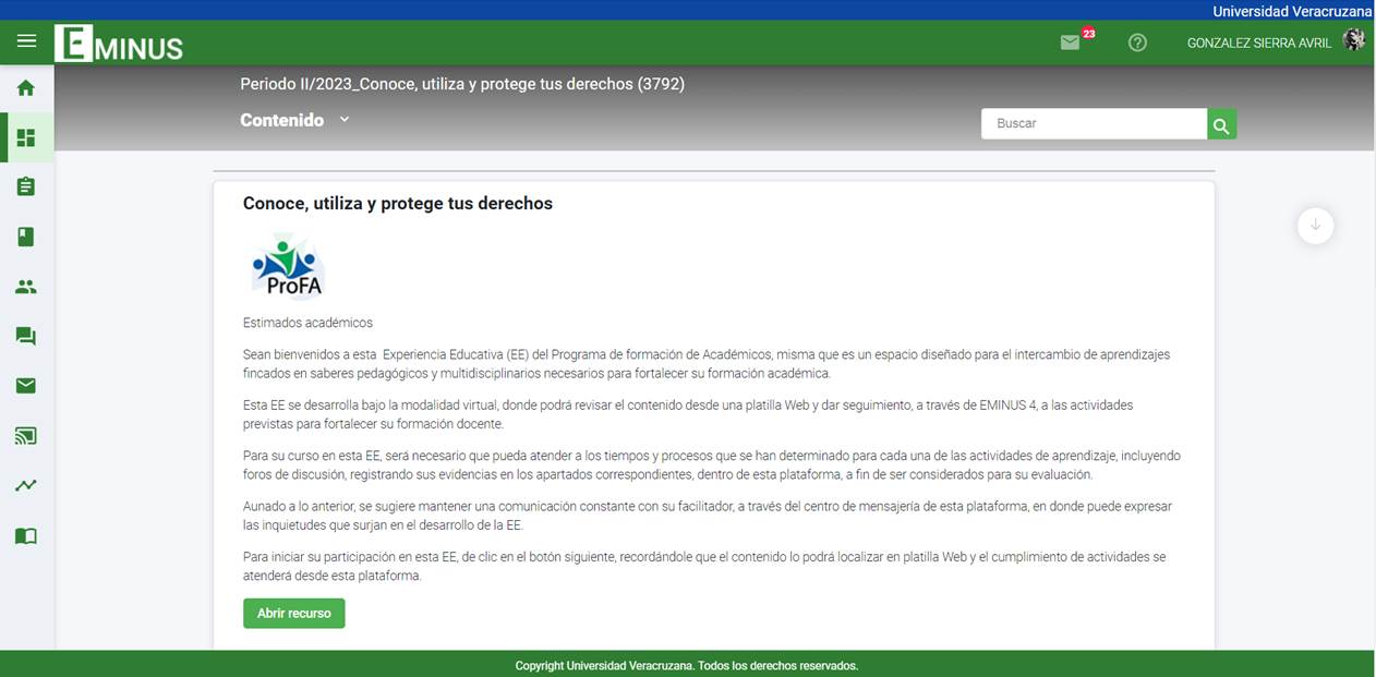 La Universidad Veracruzana (UV) a través del departamento de formación académica y el Programa de formación de Académicos (ProFA) brindan a la comunidad académica un espacio en el que a través de un diverso catálogo de Experiencias Educativas (EE) se pueda realizar el intercambio de aprendizajes fincados en saberes pedagógicos y multidisciplinarios en el fortalecimiento su formación académica. Estas EE que pueden ser desarrollados en un ambiente presencial y virtual por medio de las plataformas institucionales como lo es EMINUS 4.