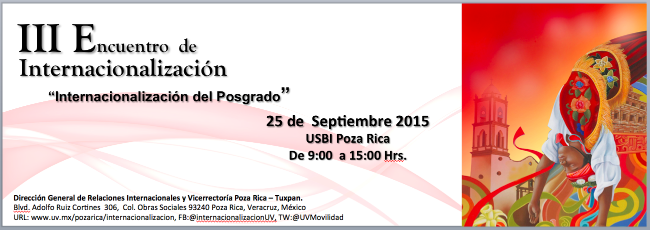 La educación superior en México está actualmente inmersa en proceso de transformación profunda en su definición, esencia y operatividad. Al mismo tiempo, la Universidad Veracruzana busca ocupar un lugar de importancia en la zona norte de Veracruz para impulsar la competitividad de los sectores gobierno, industria, academia mediante el impulso de una visión global y con estrategias claras de impulso a la calidad administrativa, operativa y educativa. En este ambiente de transformación el tercer encuentro de internacionalización se espera que sea el espacio idóneo para que estudiantes, profesores e investigadores participen de manera activa para establecer lazos con instituciones, empresas o dependencias de gobierno internacionales que permitan a los egresados convertirse en agentes de cambio en las organizaciones regionales. Para lograr la internacionalización al interior de las aulas es necesario proponer la inserción de la dimensión cultural globalizada para fortalecer el desarrollo profesional integral. En este ambiente de transformación y de fomento de la competitividad internacional es que el tercer encuentro de internacionalización que la Dirección General de Relaciones Internacionales de la Universidad Veracruzana organiza en la región Poza Rica – Tuxpan busca ‘analizar los retos y las oportunidades que tienen las instituciones de educación superior para lograr posgrados regionales con alcance e impacto internacional’.
