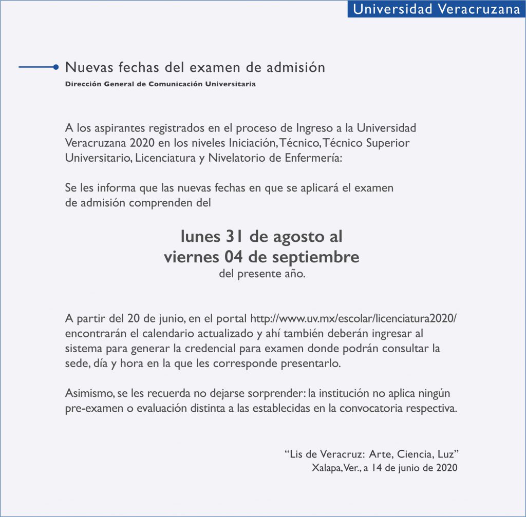 Se les informa que las nuevas fechas en que se aplicará el examen de admisión ya se encuentran disponibles: