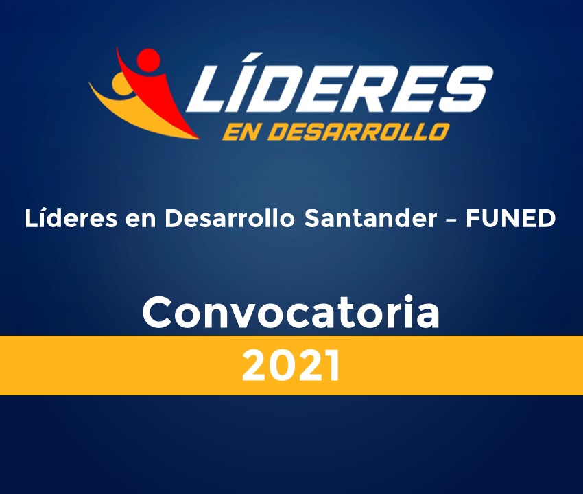Comparto con ustedes la Convocatoria 2021 de Líderes en Desarrollo Santander – FUNED, la cual estará vigente hasta el 14 de marzo de 2021, solicitando de la manera más atenta su apoyo para difundirla ampliamente entre la comunidad estudiantil y egresados (con un máximo de 3 años de egreso), a través de los diferentes medios de comunicación institucionales.