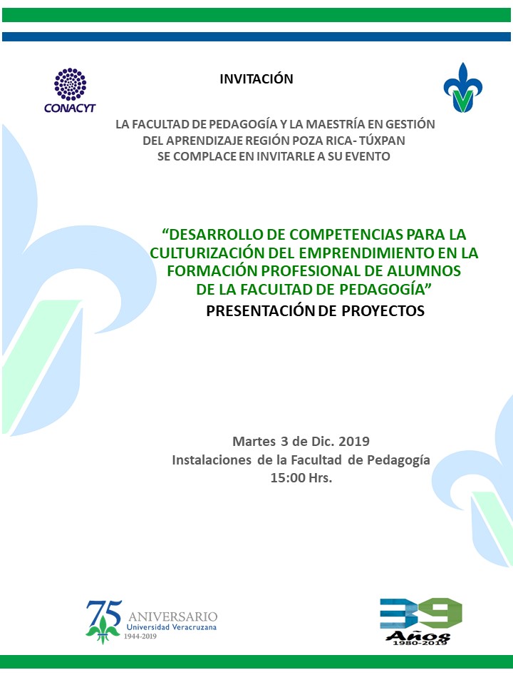 A la comunidad universitaria se les invita a la presentación de proyectos para el emprendimiento de los estudiantes de la EE de Didáctica con base en la gestión del aprendizaje de la alumna de la MGA Cynthia Berenice Montiel Vela.