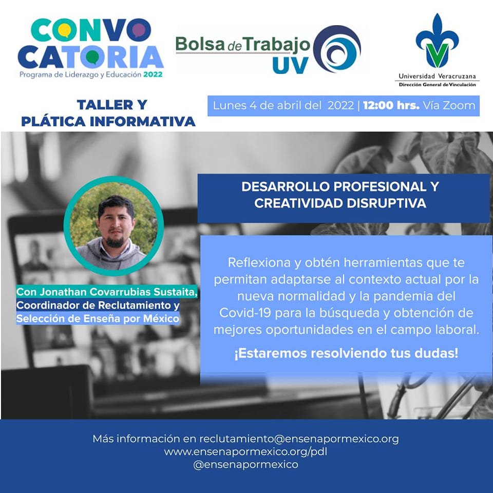 Derivado de la Alianza que se tiene con la organización Enseña por México y en el marco de la línea de Formación para la Empleabilidad y Desarrollo Profesional de los estudiantes y egresados, que se lleva a cabo desde la Dirección General de Vinculación; se impartirá el “Taller de Desarrollo Profesional y Creatividad Disruptiva”, modalidad en línea, acceso gratuito, el día 04 de abril de 12:00 a 14:00 hrs.