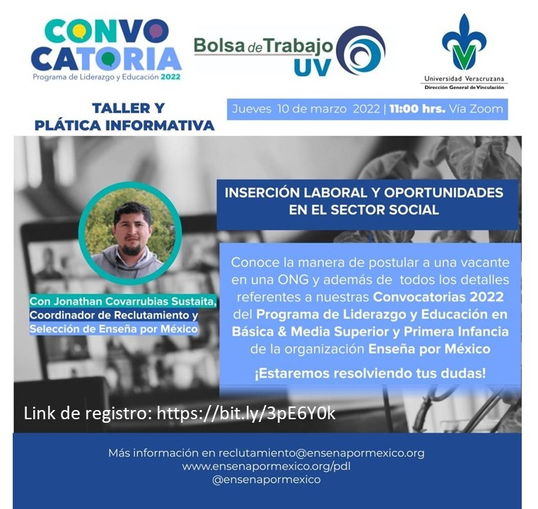 A toda la Comunidad de Egresados de la Universidad Veracruzana se les Invita al “Taller Inserción Laboral y Oportunidades en el Sector Social,” el día 10 de marzo de 11:00 a 13:00 hrs. El cual tiene como objetivo que los egresados UV conozcan la manera de postular a vacantes en organizaciones sociales. Asimismo, se brindará información a los egresados en búsqueda de empleo sobre la Convocatoria 2022 para formar parte del equipo Enseña por México y del Programa de Liderazgo y Educación, que por primera vez tendrá vacantes para las nuevas sedes del estado de Veracruz: Cotaxtla, Soledad de Doblado y Gutiérrez Zamora.