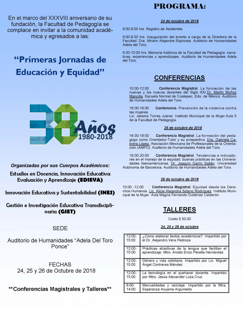 Primeras Jornadas de Educación y Equidad En el marco del XXXVIII aniversario de su fundación, la Facultad de Pedagogía se complace en invitar a la comunidad académica y egresados a las: “Primeras Jornadas de Educación y Equidad” Programa