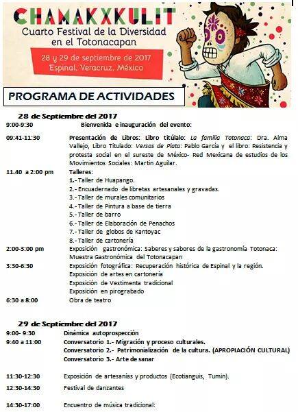 Por este medio me dirijo a ustedes para hacer de su conocimiento que durante los días 28 y 29 de septiembre del presente, la sede UVI Totonacapan ubicada en el municipio de Espinal, llevará a cabo el 4o Festival de la diversidad en el Totonacapan, en el cual se desarrollarán diversas actividades como talleres, presentaciones de libros, muestra gastronómica, entre muchas otras (anexo programa en versión web).