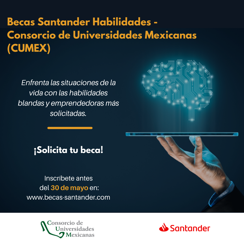 Convocatoria «Becas Santander Habilidades – Consorcio de Universidades Mexicanas (CUMEX)», la cual es una iniciativa para la formación de habilidades blandas y emprendedoras, dirigida a estudiantes, profesores y recién egresados (máximo dos años de haber concluido los estudios).