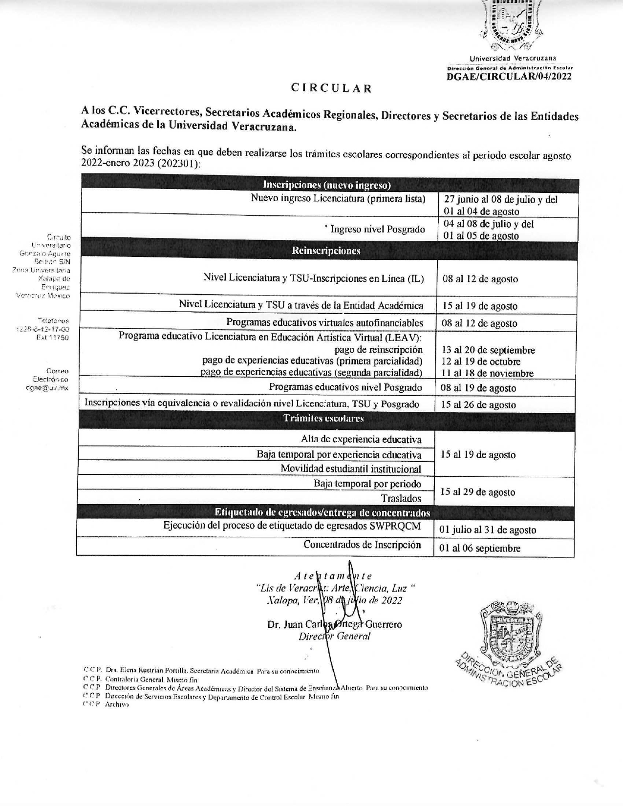 Con relación a la circular DGAE/CIRCULAR/04/2022, firmada por el Director General de Servicios Escolares la cual describen fechas de Reinscripciones en Línea del 8 al 12 de agosto
