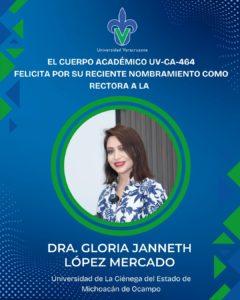 El Cuerpo Académico UV-CA-464 Ciencia, Ingeniería e Inteligencia Ambiental (CIIA) de la Universidad Veracruzana extiende una cordial felicitación a la Dra. Gloria Janneth López Mercado por su reciente nombramiento como rectora de la Universidad de la Ciénega del Estado de Michoacán (Ucemich).