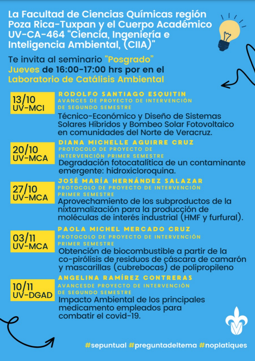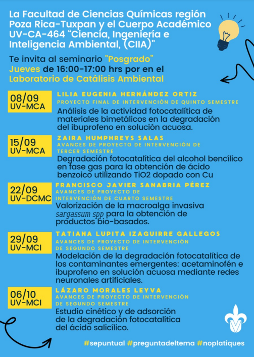 Seminario de Posgrado 2022 La Facultad de Ciencias Químicas región Poza Rica – Tuxpan y el Cuerpo Académico UV-CA-464 «Ciencia, Ingeniería e Inteligencia Ambiental, (CIIA)». Te invita al seminario «Posgrado»: