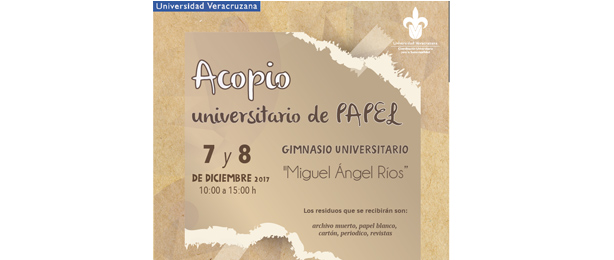 La Universidad Veracruzana (UV), a través de la Coordinación Universitaria para la Sustentabilidad (CoSustenta), llevará a cabo el Acopio Universitario de Papel “¿Y tú, qué papel juegas?”, los días 7 y 8 de diciembre en el Gimnasio Universitario “Miguel Ángel Ríos”, de 10:00 a 15:00 horas.